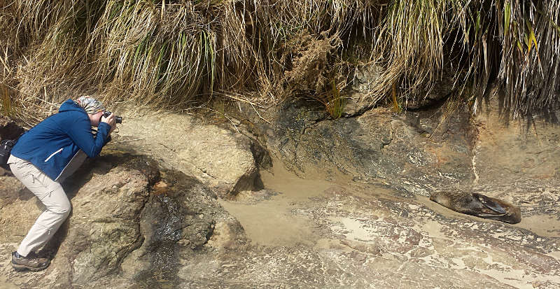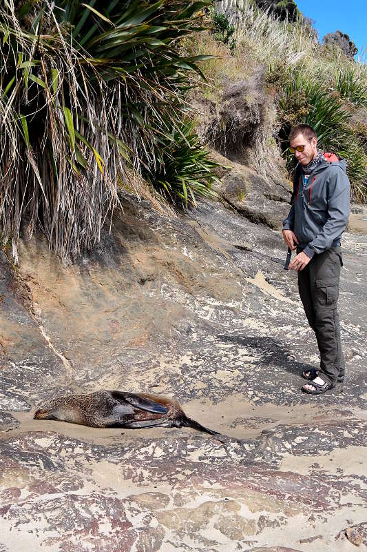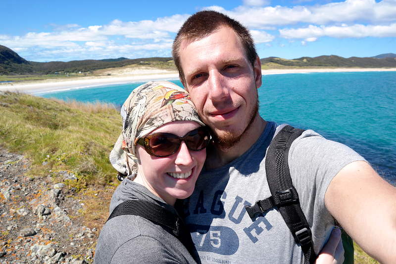 Oben, neben dem Leuchtturm kann ich plötzlich schlechter sehen – für mich ein typisches Anzeichen einer beginnenden Migräne. Leider habe ich häufiger Migräne, aber ich hatte keine Tabletten dabei. Ich habe mich hingelegt, getrunken und etwas ausgeruht, aber es wurde nicht besser und wir waren wirklich am äußersten Ende des Tracks – weit weg von unserem Auto und anderen Menschen. Naja ganz so weit weg waren sie nicht, denn plötzlich haben wir zwei Menschen auf die Halbinsel gehen sehen. Wir sind ihnen entgegen gegangen und haben schließlich festgestellt: Wir kennen sie! Es war das Paar, das uns in Trounson die roten Lampen geliehen hat. Es gibt Zufälle, die gibt es gar nicht. ^^ Leider hatten sie keine Schmerztabletten dabei, aber wir haben uns gut unterhalten und die Erinnerung an die Kiwis hat mir gut getan. – Irgendwie haben wir es zurück zum Auto geschafft. Ich hatte das Gefühl mein Körper hat auf „Überlebensmodus“ geschaltet. Ich hatte Kopfschmerzen, mein Arm und mein halbes Gesicht waren taub, ich habe schlecht gehört, aber ich konnte noch den ganzen Weg laufen. Jonas hat sich super um mich gekümmert, aber er musste mich – Gott sei Dank – nicht tragen.