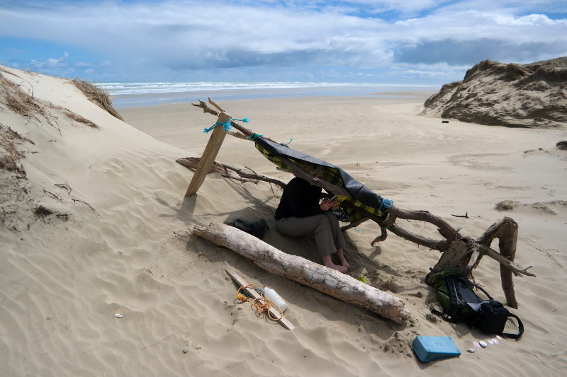 Wir hatten einen sonnigen Tag und Jonas hat uns ein kleines Shelter aus Strandgut gebaut. 😉