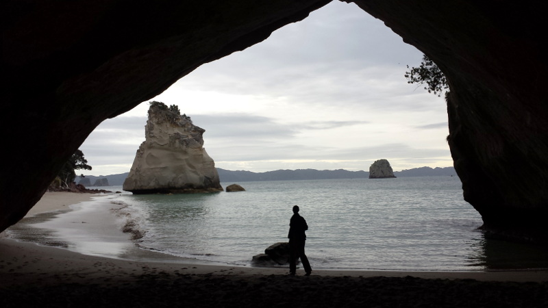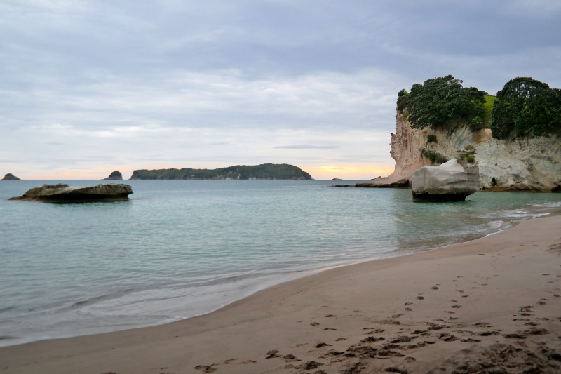 Die Cathedral Cove ist DER Strand auf Coromandel. Ein paar kennen ihn vielleicht aus dem Narnia-Film. Ich habe schon hunderte wunderschöne Bilder davon gesehen und wollte natürlich selber wunderschöne Bilder machen. Ich habe gelesen, dass das Morgenlicht besonders gut ist, daher habe ich die anderen angetrieben sich zu beeilen. Was ich nicht gehört hatte oder irgendwie überlesen hatte ist, dass man zur Cathedral Cove nur über einen 45-minütigen Fußweg kommt… Ups. ^^ Ich bin mit meinen (kaputten) Flip-Flops los gedüßt. ^^ Uns sind einige Leute mit fetten Kameras entgegen gekommen… joa, die beste Show haben wir wohl dann verpasst. Aber als wir unten ankamen, war fast niemand da.