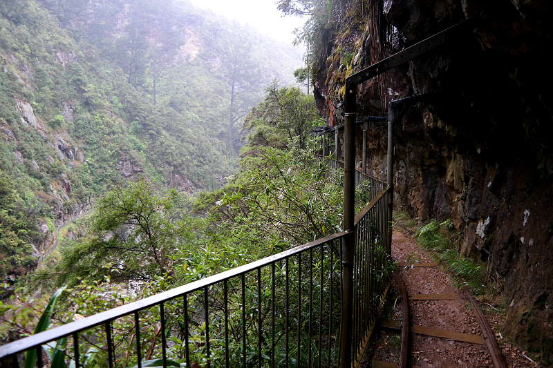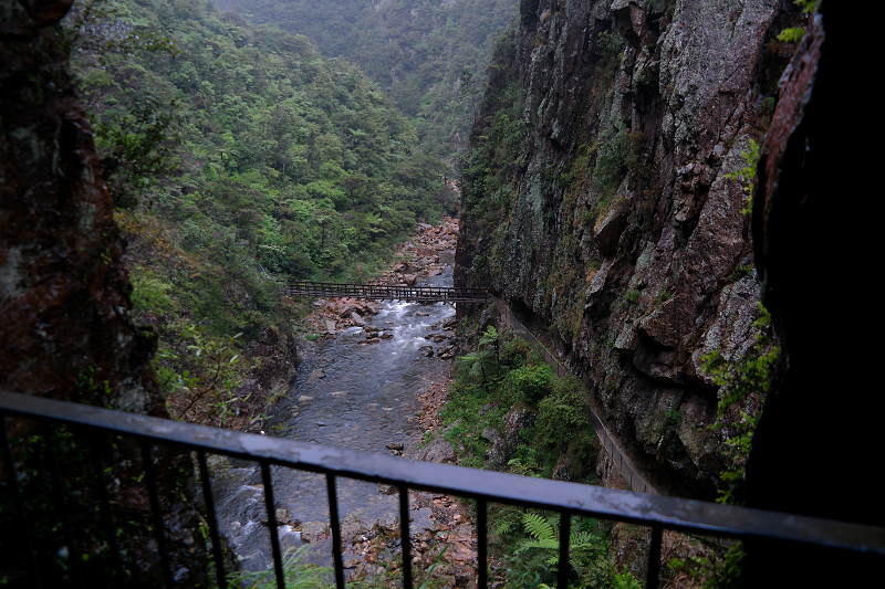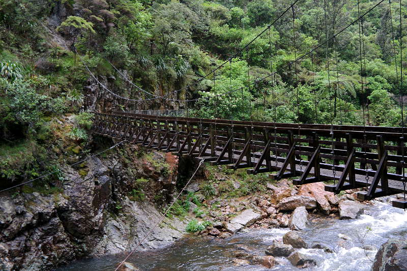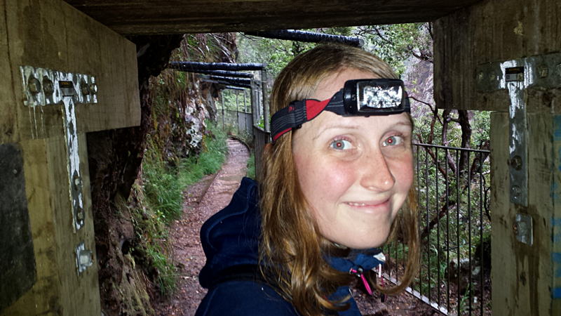 Gegen Abend wurde es langsam weniger, deshalb haben wir uns noch zu einer weiteren Coromandel-Besonderheit getraut. Auf Coromandel wird schon lange aus dem Erzgestein Gold gewonnen. Bei der Karangahake-Gorge kann man auf verschiedenen Tracks durch alte Mienentunnel gehen, die Ruinen der Gebäude angucken und auf Infotafeln mehr über die Goldgewinnung erfahren. Das ganze zwischen zwei Bergen an einem Fluss.