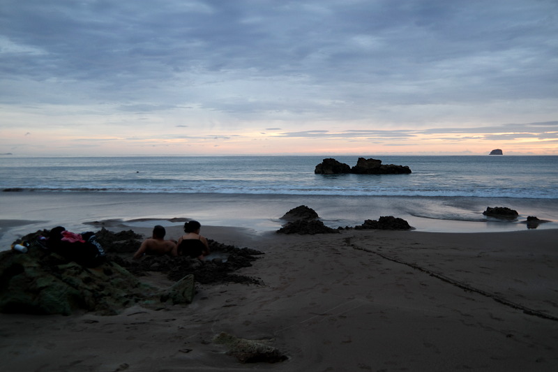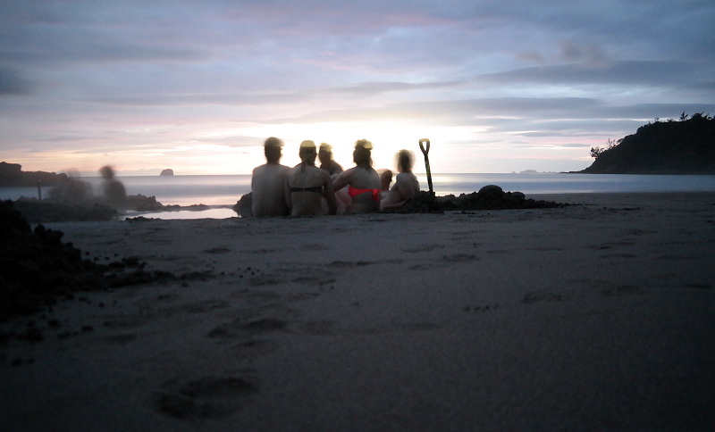 Nun ja, irgendwann wurde es dann doch endlich Zeit zum Aufstehen. Auf dem Parkplatz am Hot Water Beach war kein Auto, mit der Schaufel bewaffnet sind wir zum Strand gelaufen – zum Glück waren die beiden Mädels schon mal bei Tageslicht da, ich hätte den Weg nicht direkt gefunden. ^^ Am Strand sind wir dann in die Richtung der Taschenlampen und des Dampfes gegangen. Jap, es war stockdunkel und hat am Strand gedampft. Cool! Die heißen Quellen sind richtig heiß, man darf sein Loch nur in der Nähe buddeln, sonst verbrennt man sich. Im Dunkeln ist das natürlich etwas schwierig… ich bin ein paar Mal barfuß auf eine seeehr heiße Stelle gedappt – Au… Jonas hat für uns vier ein riesiges Loch gebuddelt und wir hatten schnell unseren Hot Pool.