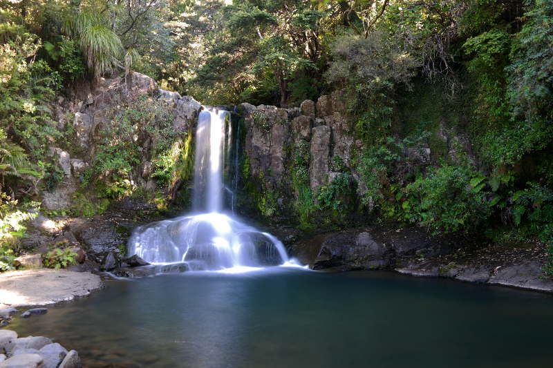 Nun, auf dem Rückweg wollten wir den gefährlichen Teil an der Seite zwischen den Cabbage Trees vermeiden und sind daher geradeaus gegangen. Wir dachten wir hätten unten auch einen direkten Weg gesehen. Böser Fehler! Wenn der Weg kein Rundweg ist, versucht niemals einen anderen Weg zurück zu gehen. Wir sind den steilen Abhang hinunter geruscht und geklettert und standen irgendwann mitten im Busch, keine Spur mehr von einem Track! Wir haben uns verlaufen! Eigentlich dachte ich, dass würde mir nicht so viel ausmachen, aber als ich dann mitten im Wald stand ohne Weg, erschöpft und zittrig vom steilen Bergabgehen, da habe ich echt schnell Panik bekommen. Wir hatten zwar Karten auf dem Handy und GPS-Empfang, aber das Gefühl nicht zu wissen wo ich bin und wo ich hin soll war erdrückend. Ich habe angefangen nach Hilfe zu rufen – im Wald gehen Schreie nur bis zum nächsten Baum. Wir wussten auch, das hinter uns niemand mehr auf den Track gegangen ist… Jonas hat versucht mich zu beruhigen, aber mit jedem Schritt durch das Unterholz, zwischen Lianen, über Flüsse… wurde meine Panik größer. Auf dem Handy konnten wir sehen, dass wir nur noch wenige Meter von der Straße an der unser Auto steht entfernt sind. Wir klettern also auf einen Hügel und stehen vor einer stacheligen Wand aus picksigen Pflanzen. Kein Durchkommen! SCHEISSE! Ich war echt fertig und frustriert… Wir sind an den Pflanzen entlang gegangen, aber sie waren überall zwischen uns und der Straße. Also durch! Jonas ist voraus gegangen und hat „gebulldozert“. Ich bin hinter ihm her gekrochen. Stacheln überall – an den Armen, an den Beinen, auf dem Kopf und im Gesicht. Horror! Aber nach ein paar Metern (mir kam es ewig vor) die gute Nachricht von vorne: „Ich sehe die Straße!“ Wir haben es also wieder raus aus dem Busch geschafft zu unserem Auto. Wir hatten wirklich überall Stacheln und Kratzer – Jonas natürlich noch viel mehr als ich – und es war uns plötzlich sooooo heiß. Puh, was für eine Erleichterung! Nach einer Verschnaufpause sind wir weiter gefahren zu einem kleinen Wasserfall. Dort haben wir spontan beschlossen Baden zu gehen. Das Wasser war sehr sehr kalt, aber sehr erfrischend und angenehm auf den ganzen Kratzern.