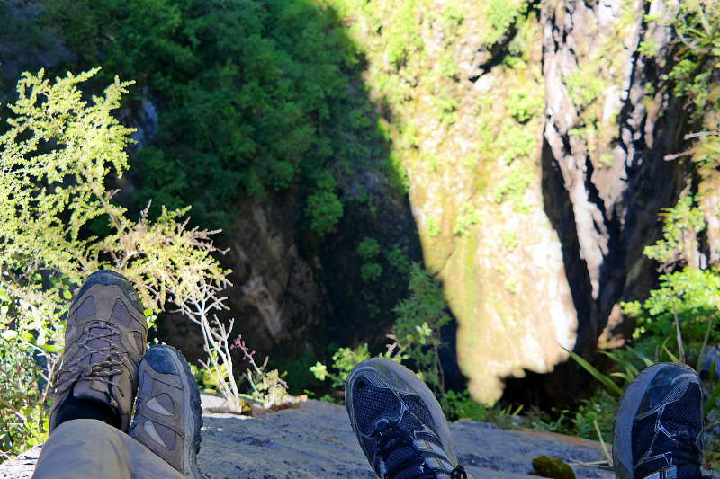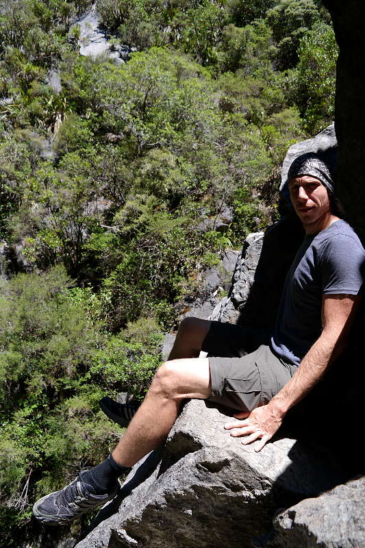 Am Loch selbst waren wir zuerst überrascht – keine Absperrung oder ähnliches, man kann direkt an den Rand klettern und versuchen runter zu gucken. Das haben auch zahlreiche Kiwis mit ihren Kids gemacht… Neuseeländer eben. ^^ Wir haben uns am Rand in den Schatten auf einen Felsen gesetzt und unsere Füße in den Abgrund baumeln lassen, dabei haben wir den zahlreichen Rufen der Kinder „ECHO – Echo…“ und dem Gesang der Bellbirds gelauscht. Cool!