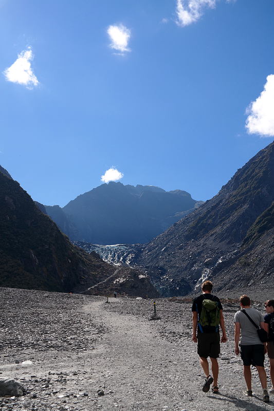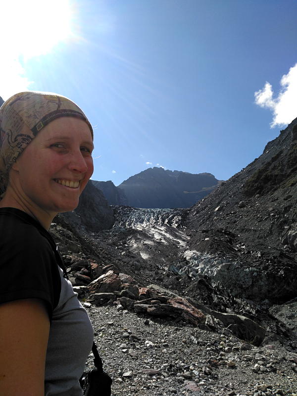 Auf den Bildern oben könnt ihr schon erahnen, was die Besonderheit des Franz-Josef und Fox Gletschers ist – sie sind unglaublich nah am Meer und dem Regenwald. Sie gehen quausi in den Regenwald über. Nun war es also an der Zeit die Gletscher „von der Nähe“ anzugucken. Dafür sind wir zuerst nach Franz-Josef gefahren und haben den Valley Walk zum „Franz-Josef“ gemacht. Der Weg ist relativ einfach über Steine am grauen Gletscherfluss entlang bis zu einem Aussichtspunkt auf den Gletscher. Die Gletscher schrumpfen zur Zeit und nach Unfällen durch Eisbruch darf man nicht mehr sonderlich nah ran gehen – ein freundlicher „DOC-Ranger“ hält einen zurück. 😉 Es war trotzdem total schön und sehr beeindruckend. Eine riesige Eisfläche glitzert blau in der Sonne. ❤ WOW!