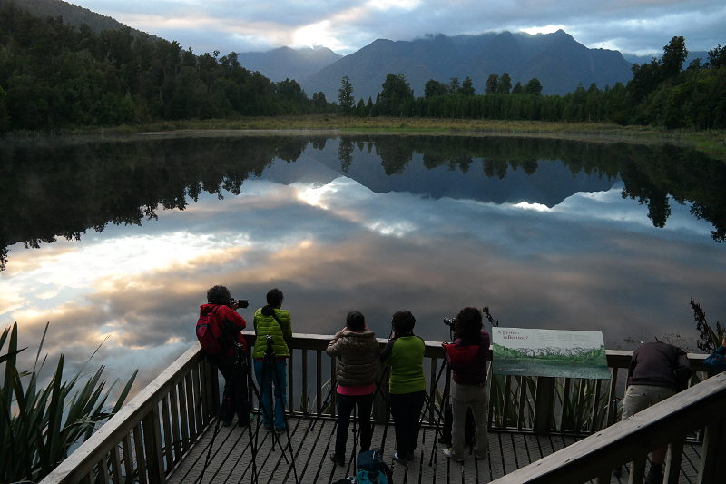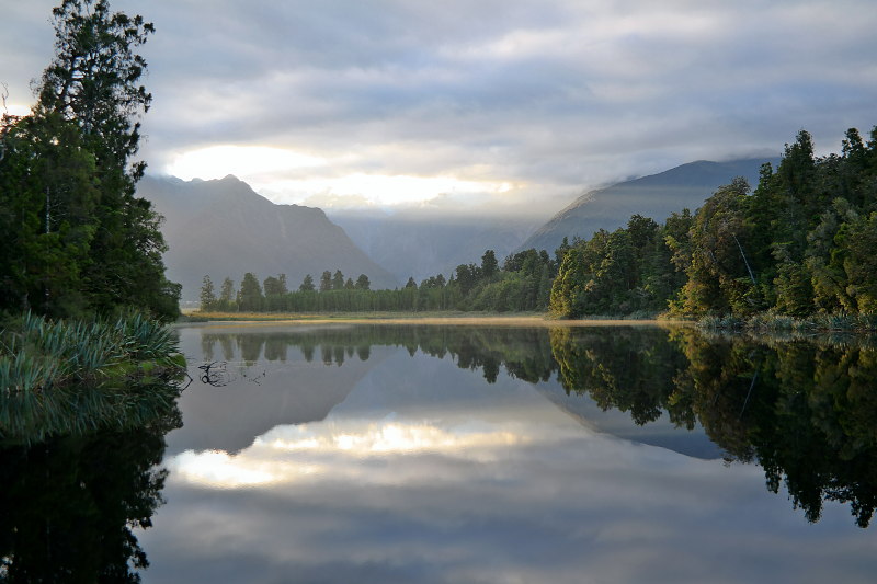 Am nächsten Morgen sind wir sehr früh aufgestanden um den Mirror-Lake Matheson noch ruhig ohne Wellen zu erwischen. Noch ohne Frühstück sind wir in den Wald geflitzt. Bei der ersten kleinen Aussichtsplattform: Oh, es ist noch Nebel auf dem See – cool!