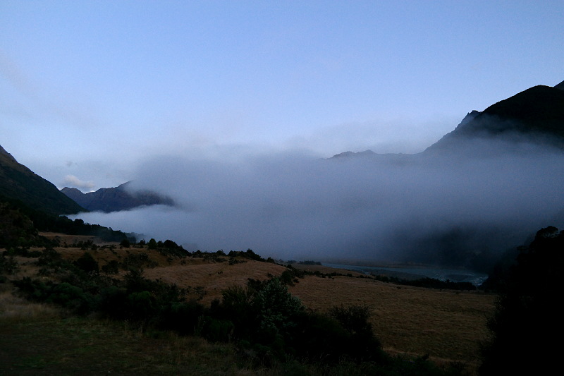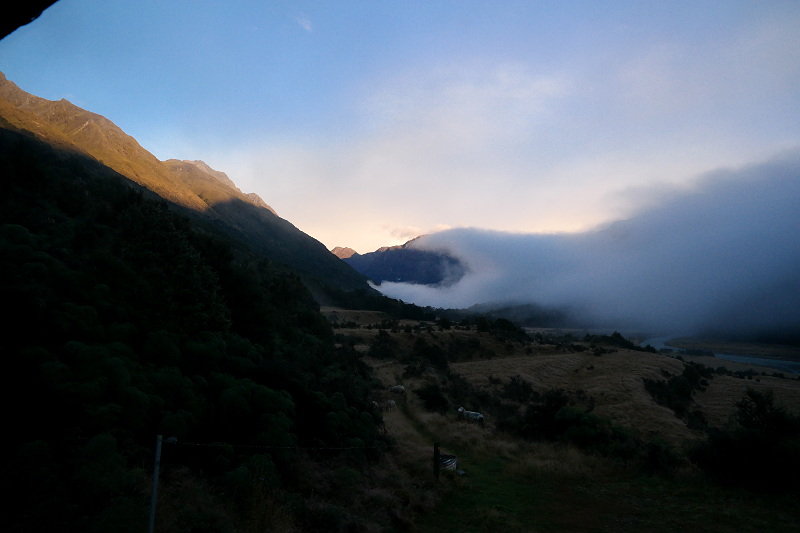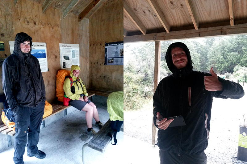 Der nächste Morgen startet mit einem Regenbogen, Sonne und unserer Entscheidnung: Jetzt geht’s los! Wir packen also alle vier unsere Rücksäcke voll… langsam zieht es zu… wir packen alles ins Auto… es fängt an zu nieseln… steigen ins Auto und fahren los – es regnet wieder wie aus Eimern! Ah aber nein, es gibt kein zurück mehr, wir fahren jetzt zum Parkplatz. Wir zittern etwas an den Bächen, aber der Bongo schafft alle drei ohne Probleme – in Glenorchy ist der Gute zum Geländewagen mutiert. 😉 Auf dem Parkplatz: Regen, Regen und noch mehr Regen. Auch nach dem Mittagessen sieht es nicht besser aus…