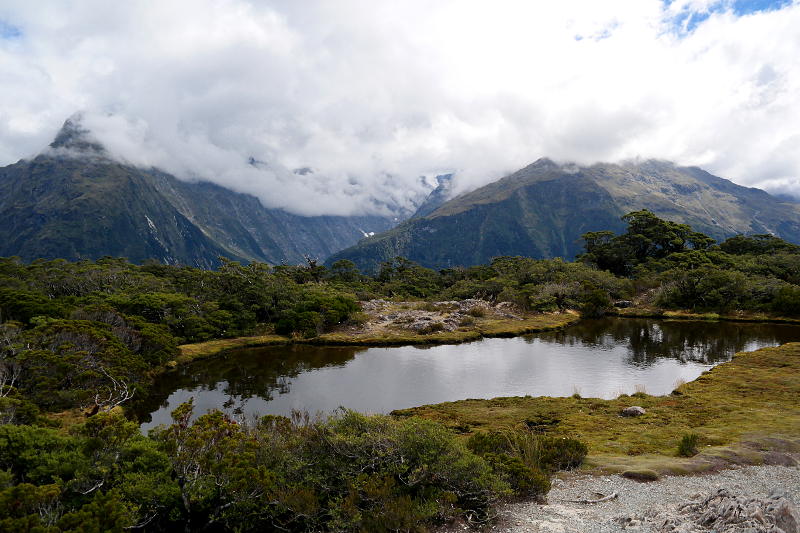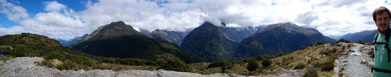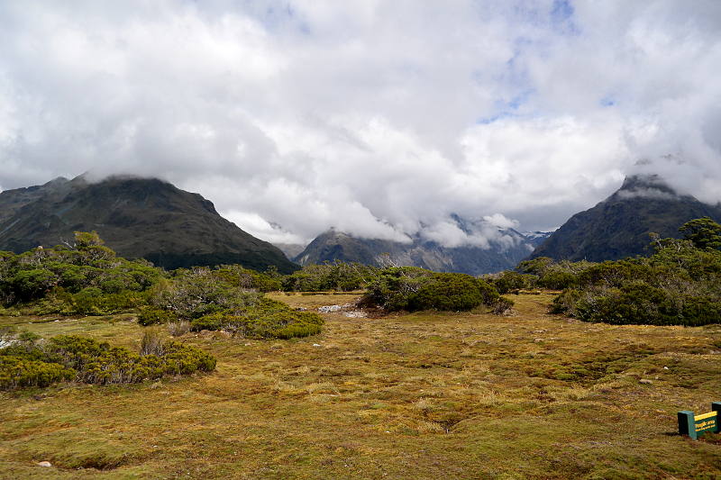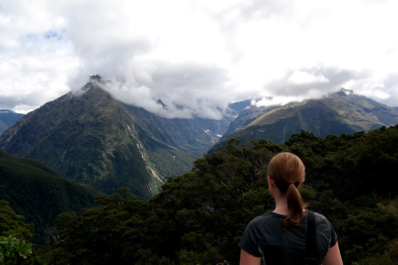 Durch das gute Wetter ermuntert haben wir uns anschließend auf den Weg auf den „Key Summit“ gemacht. Dieser Aussichtspunkt am Anfang/Ende des Routeburn Tracks verspricht eine tolle Aussicht über den Beginn des National Parks. Der Anstieg ist in einer Stunde gut zu bewältigen und geht durch schönsten Busch. Oben erreicht man gerade die Baumgrenze und kann daher in alle Richtungen gucken. Wir wussten gar nicht wohin wir gucken sollen – überall Gipfel und keine Spur von Zivilisation. Wow!