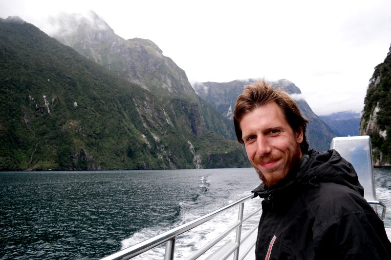 Das ist der Milford Sound. Das ist das Meer. Riesige Gletscher haben tiefe „Furchen“ ins Land gegraben und diese sind nach dem Schmelzen der Gletscher mit Meerwasser voll gelaufen. Direkt daneben ragen Felswände hunderte Meter hoch in den Himmel, häufig stürzen Wasserfälle an ihnen in die Tiefe. Ja, das müssen wir uns genauer angucken! Dafür haben wir eine kleine Bootstour gebucht. Da wir relativ spät (16 Uhr) da waren, waren die meisten Touristenbusse schon weg und unser Boot war fast das Einzige auf dem Sound. Wir haben es uns oben auf dem Deck gemütlich gemacht – wider aller doofen Vorhersagen hat es nämlich immer noch nicht geregnet – und die Fahrt genossen. Jonas hat uns immer wieder gratis-Kaffee geholt, so war es super gemütlich. 🙂 Es waren nicht viele andere Leute auf dem Boot – sehr angenehm! Wir haben einige Seals auf dem Weg gesehen (leider keine Delfine) und natürlich Wasserfälle. Ich finde es super fasziniernd wie die Pflanzen an den steilen Klippen wachsen können.