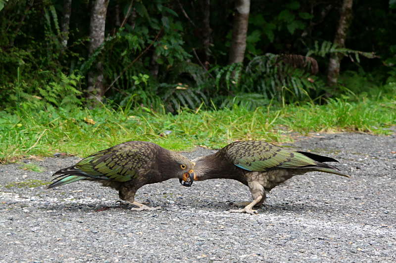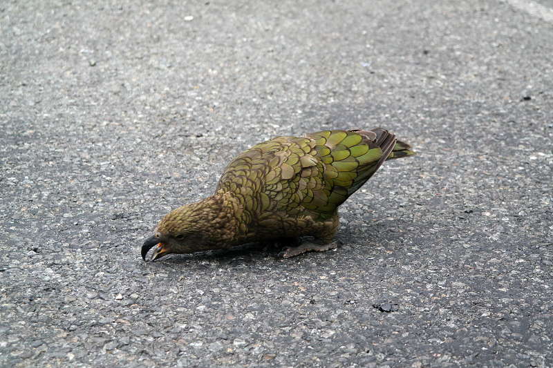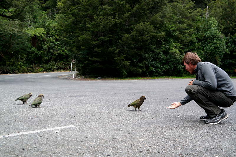 Auf dem Rückweg hat Jonas mal wieder seinen exzellenten Spürsinn bewiesen. Weil er etwas gesehen hat ist er auf einen Parkplatz abgebogen – und dort waren zahlreiche Keas unterwegs. Meine Liebe zu diesen intelligenten Papageien habe ich ja schon mal ausgiebig geschildert aber seit dem haben wir keine mehr gesehen! Auf den Parkplätzen sind sie wohl üblicherweise unterwegs um von Touristen gefüttert zu werden oder an den interessanten Autos rum zu knabbern… Man sollte sie niemals füttern, das schadet den Tieren und verstärkt das freche Verhalten alles anzuknabbern. Nun ja, wir haben uns gefreut ein paar Fotos zu machen und ihren lustigen Stimmen zu lauschen. 😉