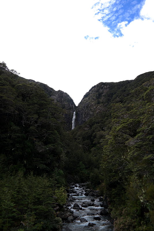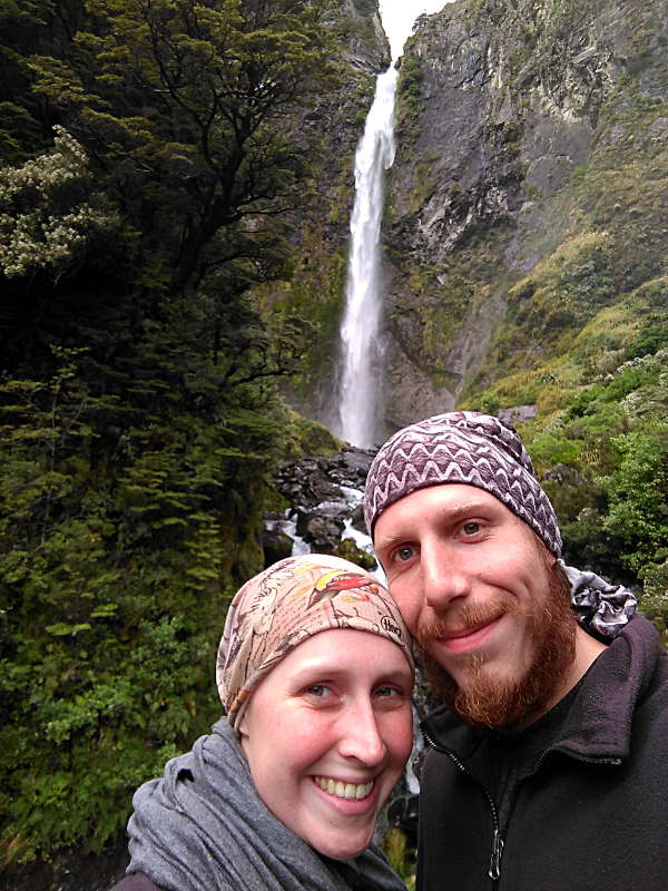 Aber wie das oft so ist mit den Bergen – da hängen die Wolken, da hängt der Regen. Je näher wir gekommen sind um so dunkler wurde es. Im „Ort“ hat es leicht genieselt und wir hatten gar nicht so große Lust aus dem Auto auszusteigen. ^^ Zu einer kleinen Wanderung konnten wir uns dann aber doch irgendwie aufraffen – wir mussten ja einen Track im Nationalpark „Arthurs Pass“ machen. 😛 Es ging durch wunderbaren Buchenwald zum „Punchbowl“ Wasserfall.