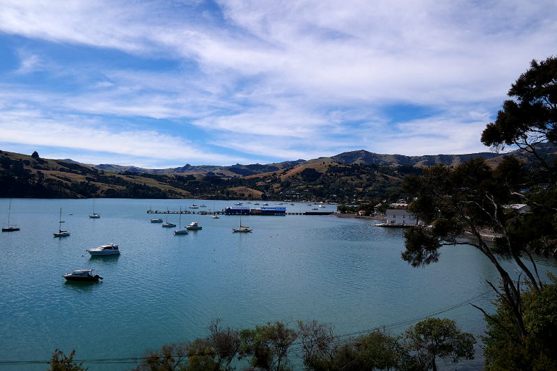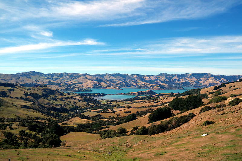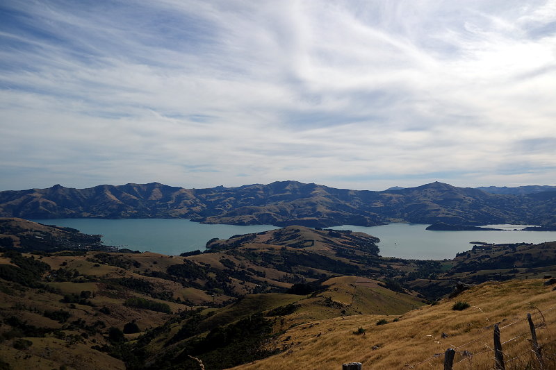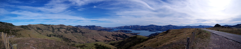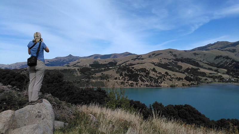 Von hier aus kann man auch Bootstouren machen, auf denen man gute Chancen hat Hector-Delfine, Pinguine und Robben zu sehen. Da wir das alles schon lääängst gesehen haben – kein Boot fahren für uns. Dafür ging es hoch auf den ehemaligen Kraterrand. Von oben hatten wir einen prima Blick auf Akaroa und die Halbinsel.