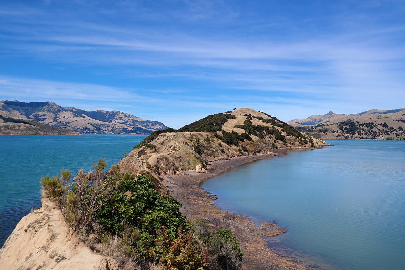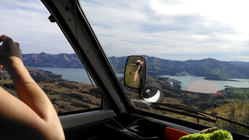 Besser! ^^ Eigentlich wollten wir am nächsten Tag nach Christchurch fahren, aber ein paar Radler haben uns die Banks Halbinsel hinter Christchurch empfohlen und das Wetter war prächtig – also erst mal drum herum fahren und noch ein bisschen die Stadt meiden. Da sind wir inzwischen ganz unsicher und schnell gestresst… Outdoorfreaks. ^^ Die Banks Halbinsel war (auch) mal ein Vulkan. Es gibt eine kleine Rundtour um die Halbinsel zu erkunden. Wir sind zuerst „runter“ gefahren.