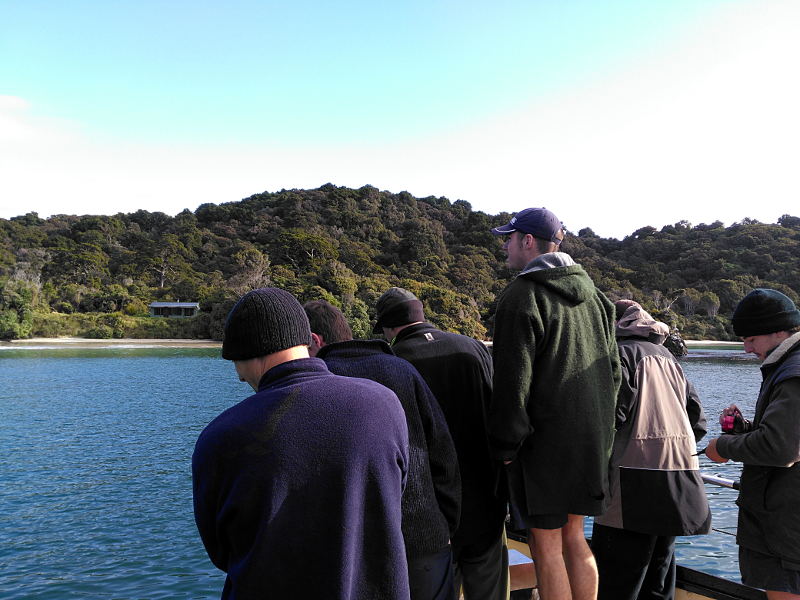 Nach der nächsten sehr kurzen Nacht geht es dann richtig los. Kiwis fahren nicht mit der Fähre nach Stewart Island und wandern dort zu einer Hut! Nein, sie mieten ein Schiff mit Skipper Bob der sie bzw. uns direkt in die Bucht zur Hut fährt. Der Skipper sagt die Überfahrt wird den Unterschied zwischen Männern und Jungs zeigen, denn die See ist hier wie immer rau. Aber Dean hat ein Wundermittel für mich namens „Sea Legs“ („meeresfest“) was ich nach der letzten Überfahrt gerne nehme. Somit war die Überfahrt gerettet und wir konnten mit nur einem „Fischfütterer“ im Paradies ankommen.