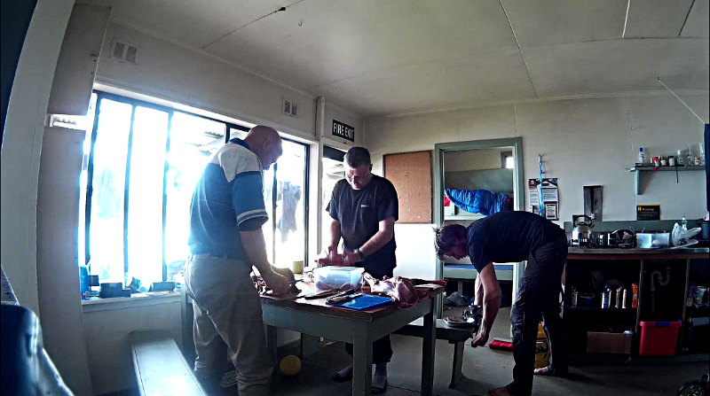 Nachdem die ganze Ausrüstung an der Hütte ist verschwinden auch schon die ersten der Jungs zum Jagen. Und Paul und ich zum Fischen. An diesem Tag haben wir zwölf Blue Cords über dem Mindestmaß von 33 cm gefangen und dazu unzählige Kleinere die wir wieder frei gelassen haben. Hier muss man irgendwann aufhören zu Fischen, damit man nicht zu viele hat, denn man muss den Fisch innerhalb von einem Tag essen da es in der Hütte keine Kühlung gibt. Und am Abend kommen zwei der Jungs auch bereits mit Weißwedelhirschen zurück. Die Freude ist sehr groß, denn diese Art ist nicht einfach zu Jagen. Und ein früher Jagderfolg bedeutet immer gutes Essen. 😉 Es gibt also wie an vielen Abenden in der Hütte ein drei Gänge-Menü bestehend aus Variationen von Fisch, Paua (die „Glizermuschel„) und Wild, denn eigentlich geht es bei diesem Trip nur ums Essen. ^^