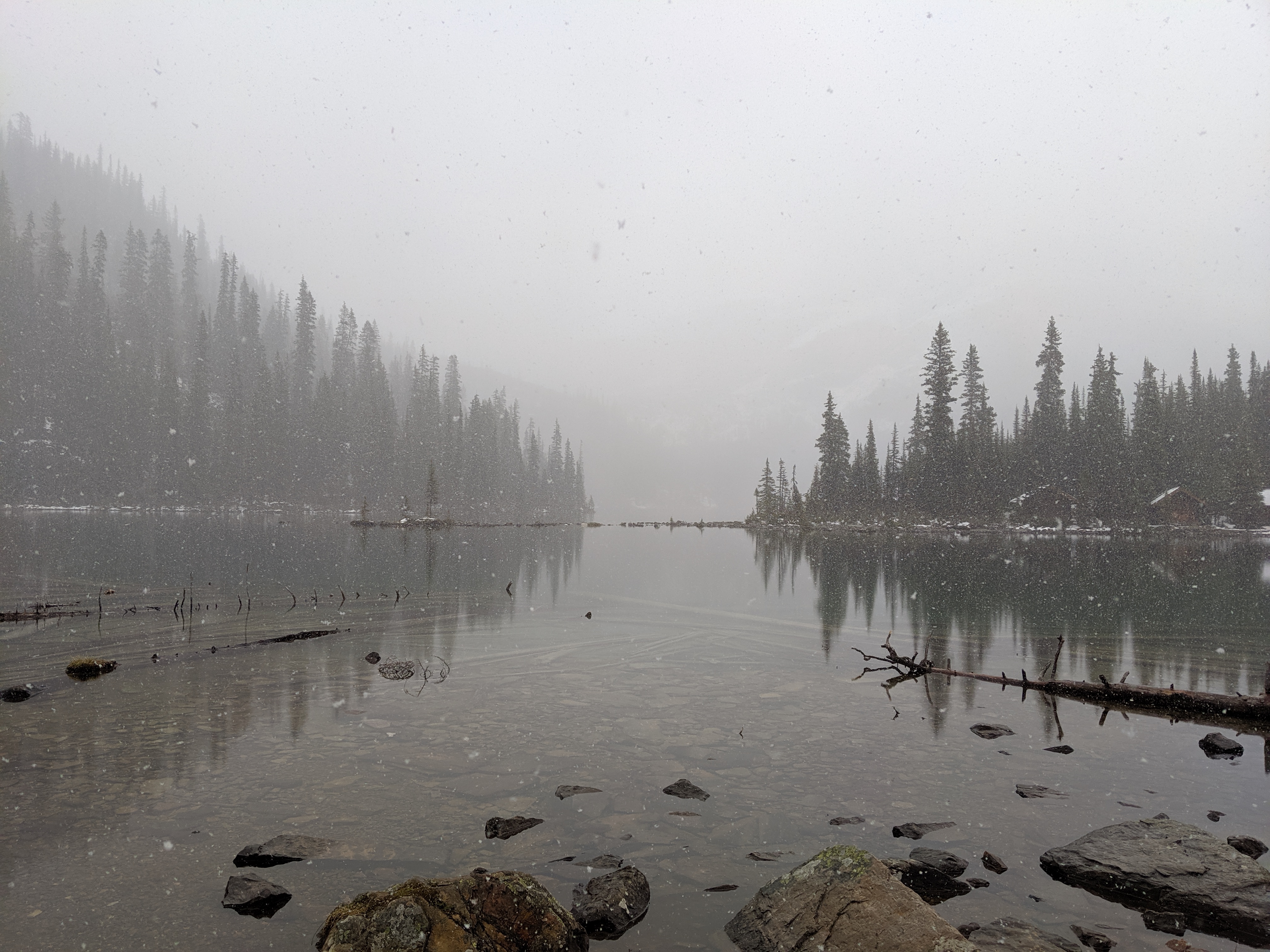 Die Elizabeth Parker Hut liegt auf 2.040 m Höhe umgeben von den Rocky Mountains. Nur wenig unterhalb liegt der wunderschöne Lake O’Hara. Den müssen wir in einer Schneepause auch gleich umrunden und freuen uns ein Loch in den Bauch: der See und die umliegenden Berge scheinen nur uns zu gehören: