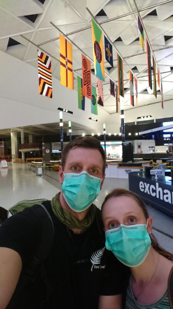 Auch am Flughafen erwarten uns jede Menge Sicherheitsleute und Polizisten. Bevor man überhaupt den Flughafen betreten darf, muss man seinen Ausweis und das Ticket vorzeigen. An diesem Tag gehen gerade mal noch acht Flieger. Ich habe Glück und kann direkt zum Qatar-Schalter gehen und unser Gepäck los werden. Jonas muss allerdings später noch mal sein Ticket holen. Am Flughafen hat fast alles geschlossen. Eine Apotheke und zwei Restaurants haben offen, sonst nichts. Das wird also nichts mit Bargeld am Flughafen los werden und noch Souvenirs shoppen. 😦 Jonas hat leider weniger Glück – er verfährt sich auf dem Weg zur Camper-Vermietung, muss dann noch mal Tanken und schafft es gerade noch rechtzeitig. Der Hof steht schon über und über voll mit Campern. Die will wohl gerade keiner mehr haben. Ebenso wenig unsere offenen Essensreste. Die müssen wir leider entsorgen. Die Mitarbeiterin ist sehr ängstlich und vorsichtig – sie gehört zur Risikogruppe und meint nur, dass wir großes Glück haben, dass wir die Versicherung gemacht haben – bei dem Schaden! Die Busfahrten zurück zum Flughafen dauern lange (dafür, dass die Strecke eigentlich super kurz ist), man kann im Bus auch nur mit Kreditkarte zahlen! Einfach dran halten – ping – es kostet „???“ und man darf mitfahren. Dann muss Jonas auch noch Schlange stehen um in den Flughafen zu kommen und natürlich hat der Qatar-Schalter nicht mehr offen. Ich mache mir schon Sorgen und bin sehr froh, als wir wieder vereint sind. Für den Flughafen und die Flüge haben wir uns unsere Mund-Nase-Masken aufbewahrt. Überall spaziert nur Sicherheitspersonal rum – wir haben ein mulmiges Gefühl. Jonas muss noch mal lange anstehen um sein Ticket zu bekommen – er kommt zurück mit einem Kopfhörer im Ohr und dem Handy in der Hand. In Deutschland gibt es in seiner Firma gerade eine außerordentliche Betriebsversammlung – es geht um Kurzarbeit. Jonas als Betriebsratsvorsitzender will natürlich dabei sein. Da alle im Homoffice sind, gibt es natürlich eine Videoübertragung und mobile Daten haben wir ja eh noch genug. Also hört und guckt Jonas Betriebsversammlung während es für uns weiter durch die Sicherheitskontrolle geht – verrückt!