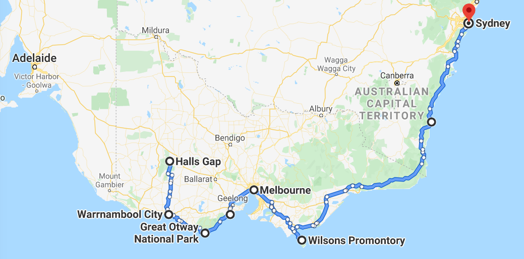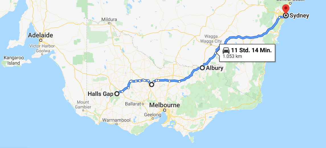 Das ist sie, die Strecke, die wir eigentlich noch vor uns gehabt hätten, unsere grob geplante Reiseroute. Mitten durch die ehemaligen Buschfeuer-Gebiete, zu wunderschönen Stränden und einmaligen National Parks. Und das ist die Strecke die nun am Montag dem 30. März 2020 vor uns liegt:
